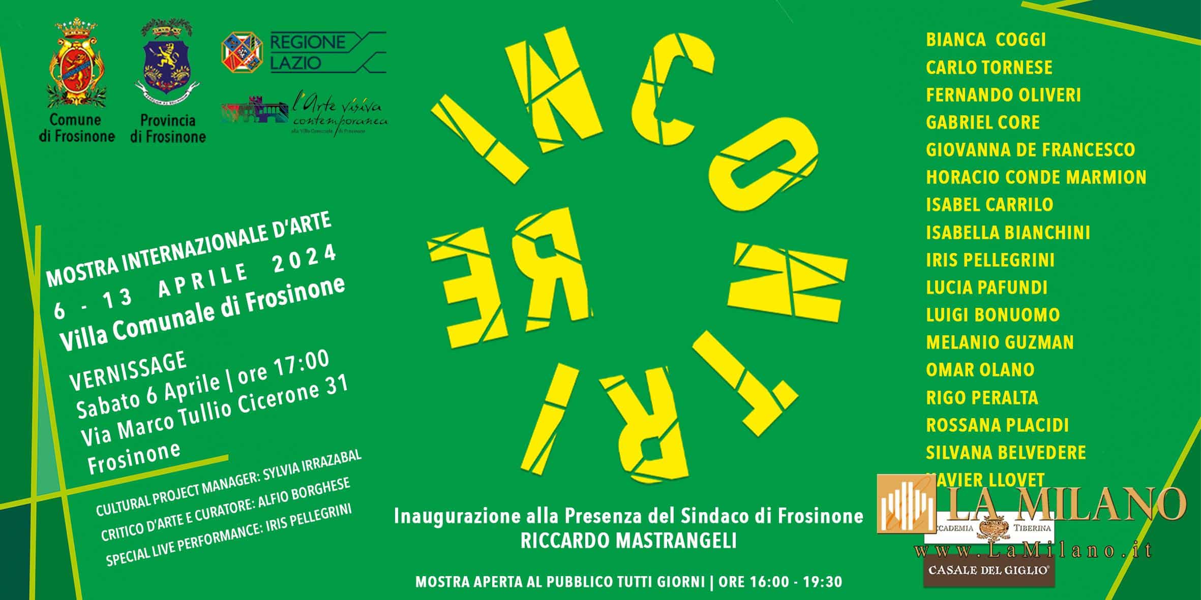 Dal 6 al 13 aprile la villa comunale di Frosinone ospiterà la mostra internazionale d’arte contemporanea dal titolo “ReIncontri”, ideata e fortemente voluta da Sylvia Irrazabal, project manager culturale da anni impegnata nella ricerca di nuovi linguaggi artistici e culturali che uniscano Europa e America Latina.