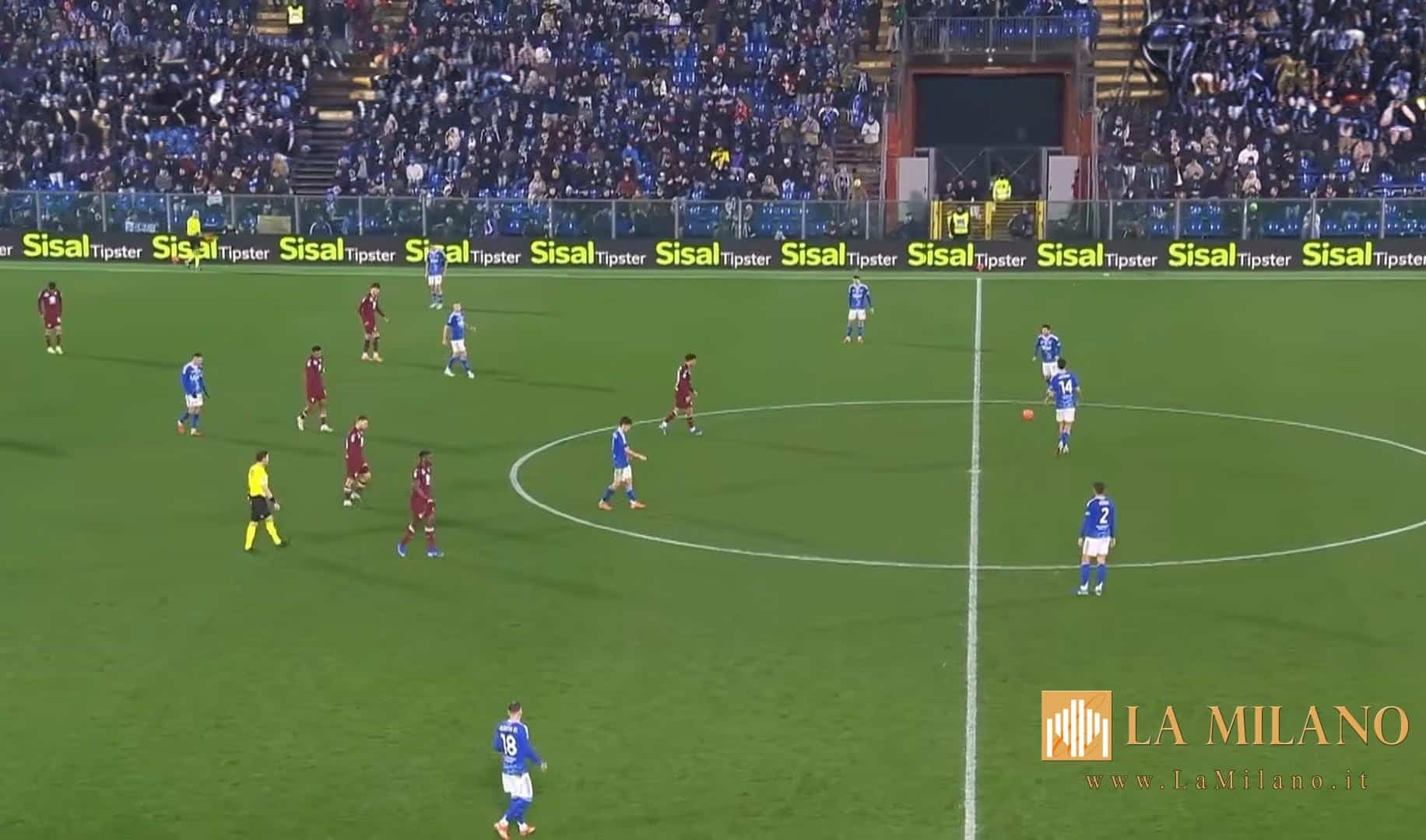 I lariano passano subito in vantaggio al minuto 8: Da Cunha serve in profondità Douvikas, che a tu per tu con Paleari è glaciale e firma l’1-0. Passano appena otto minuti e arriva il raddoppio: Baturina, dal limite dell’area, piazza un destro preciso che si infila all’angolino.